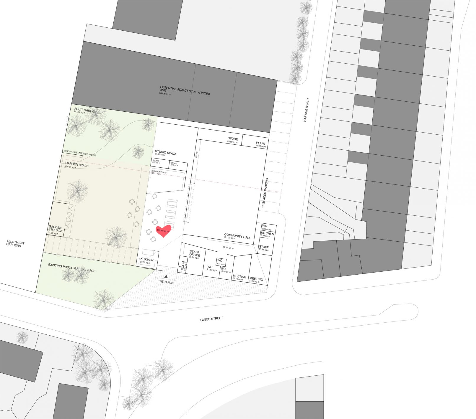 The feasibility was to develop proposals in line with a business plan towards a BIG Lottery funding application to rebuild an existing community centre at Mill Lane, Newcastle. The design proposed re-sites a new centre at the corner of the existing site as a continuation of the building line on Tweed Street, allowing a clear public presence. A large sliding door to the street elevation can protect the building out of hours, but once opened, makes a generous and inviting entrance, with views in from the street. Inside, the key focus for the building is on one significant, clear and flexible space, forming a heart for the building. This multi-purpose space (such as cafe, teaching, workshop, social space), through its connections with the building’s other facilities (studio, chill out/common room, main multi-purpose hall, ancillary spaces), feels animated, lively and sociable. By securing an outdoor green space from the street front (but allowing views in), there is the opportunity for the buildings social heart to be visually and physically connect to an outside space and flooding the interior with natural light. This outdoor space could then also become a great resource and provide possibilities for the building, whether planted garden, vegetable garden (as part of possible teaching and workshop opportunities), small woodland planting or a simple low maintenance outdoor space as children’s play area or relaxing.